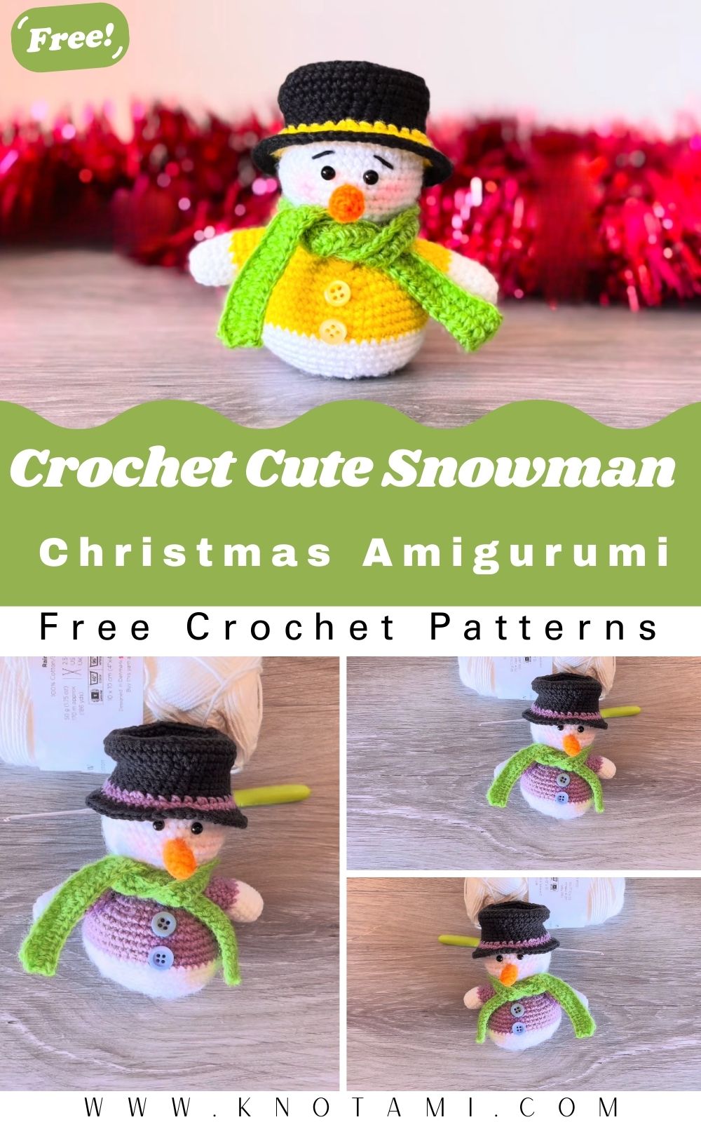 It’s perfect for Christmas because it works in so many ways: a little shelf sitter, a stocking stuffer, a gift topper, or a small handmade collectable for your holiday display. The accessories bring the festive charm: a green scarf wrapped around the neck, a black top hat with a contrasting band, and two little buttons on the front. The sweater section adds a cosy pop of colour, use yellow, or switch to soft purple/lavender for a pastel winter look.