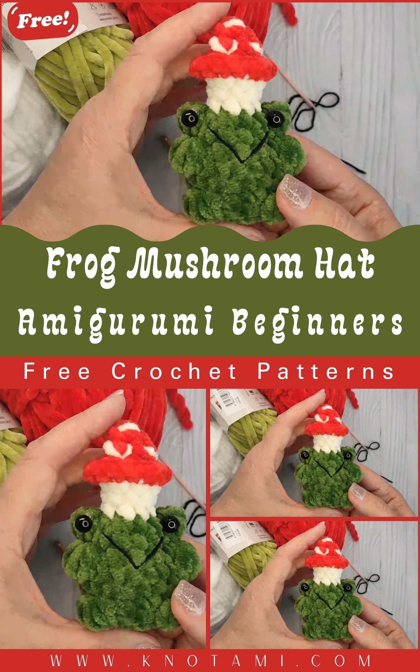Yarn: Medium-weight (worsted) acrylic or cotton yarn in green (frog body), red (hat top), white (hat spots), and a touch of pink or black for details.