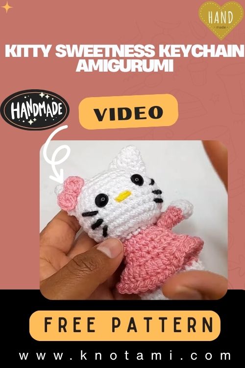 This crochet kitty keychain measures approximately 8–10 cm tall (about 10 cm in the video, measured from head to paws, excluding ears). Size varies depending on yarn weight, hook size, and how tightly you crochet.