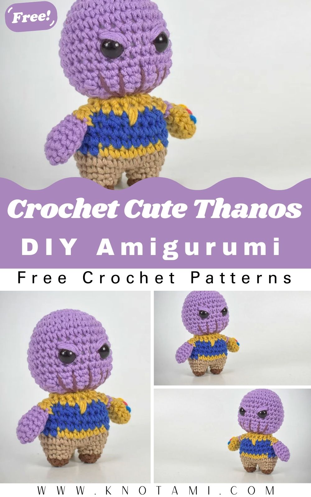 Pro tip: If you’re new to amigurumi, use tighter stitches and non-fluffy yarn it’ll make your Thanos shape crisp and easier to assemble later.